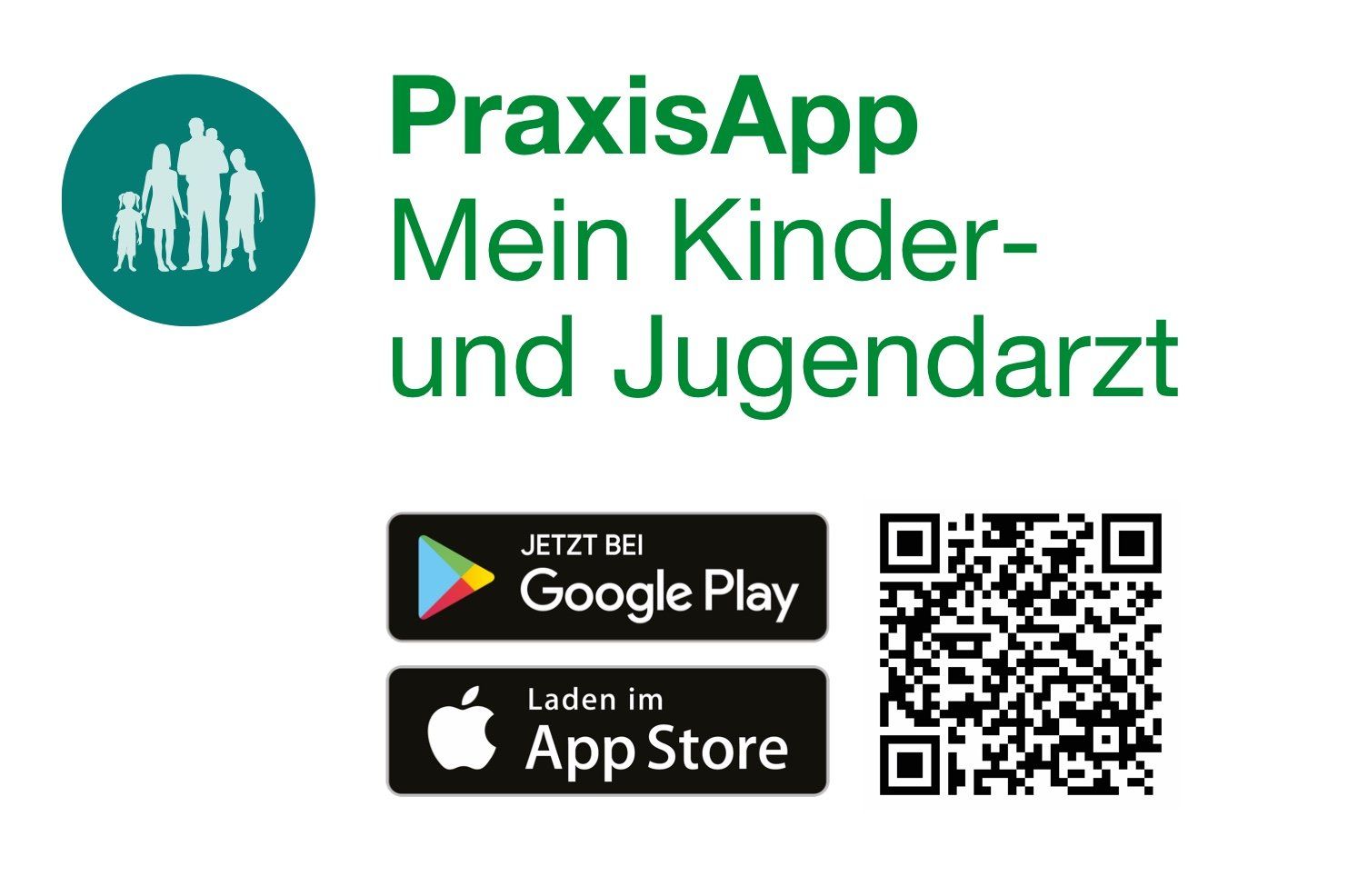Um dies in Anspruch nehmen zu können, benötigen Sie nur Ihr Handy oder ein Tablet und müssen die Praxis-App "Mein Kinder- und Jugendarzt" (siehe Grafik und QR-Code) installieren.